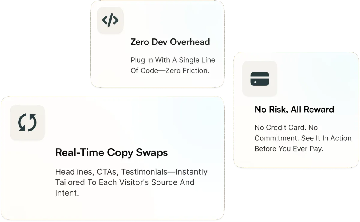 Turn static pages into dynamic fixed performers. MessageMatch personalizes copy in real time, boosting conversions by up to 30% with no developers required and no upfront cost.